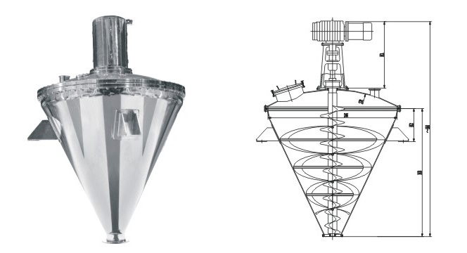 立式螺帶混合機由傳動部分、螺桿攪拌器、倒錐形桶體組成。
